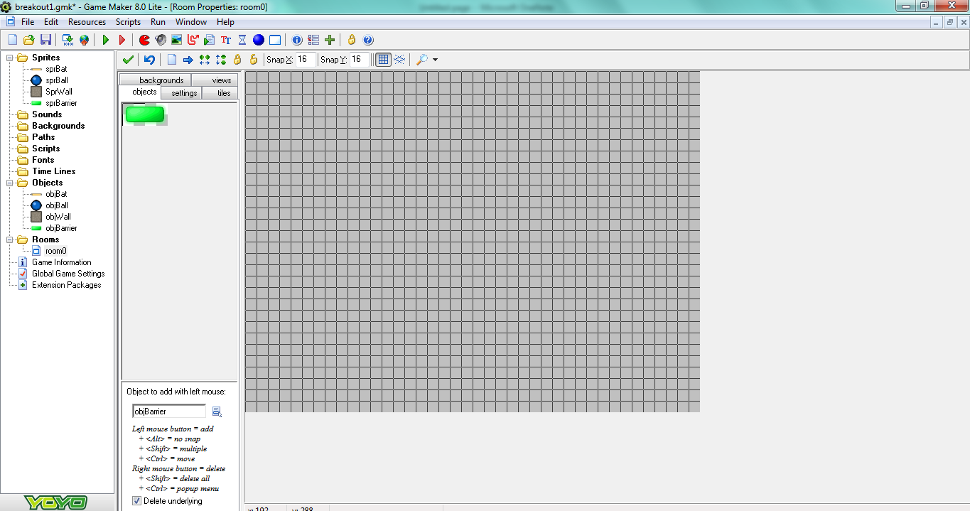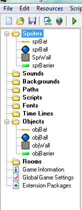 Today we are going to continue working on our game of Breakout. It will take shape by the end of this activity and be ready for us to add actions to the objects. Start by reloading the project that you saved at the end of the last Part. You should see your Sprites and Objects. If there is a plus beside Sprites or Objects you can click on it to expand the category and see each item.