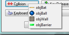Collision will bring up the list of objects that the ball can collide with. Notice Ball is listed (you can add more than one ball to the room and make them react to each other…) We have one ball for now and are working on interaction between the Ball and the Wall so we will choose objWall.
